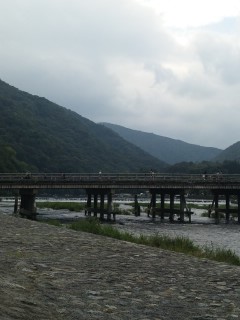 あ、ちなみに、下にある写真は、嵐山のふもとにある渡月橋です。(JR嵯峨嵐山駅から歩いて10分ぐらいの所にあります。)(撮った時は、あいにく曇り空…(ノ△T))